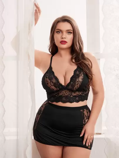 2pcs Plus Size Lace Splice Wireless Sexy Lingerie Set - Black - View 1