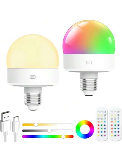 2pcs Rechargeable Light Bulb - E27 Battery Powered Bulb With 10 Dimming & Color Modes Remote Control, Suitable For Non-Hardwired Lamps, Wall Lights, Pendant Lights - E27 Lamp Holder - View 1