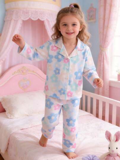 2pcs/Set Girls Casual Floral Print Long Sleeve Top And Pants Comfortable Homewear Set - Multicolor - View 1