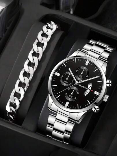 2pcs/Set Men's Fashion Calendar Quartz Watch & Bracelet Set - Silver - View 1