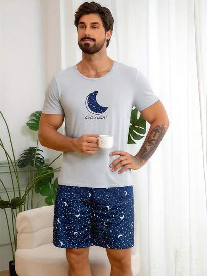 2pcs/Set Men's Moon Print Short Sleeve Shirt And Star & Moon Print Shorts Pajama Set - Grey - View 1