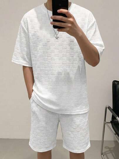 Mirajuku 2pcs/Set Teenage Boys' Casual Geometric Textured Fabric Round Neck T-Shirt Set, Suitable For Daily Commute - White - View 1