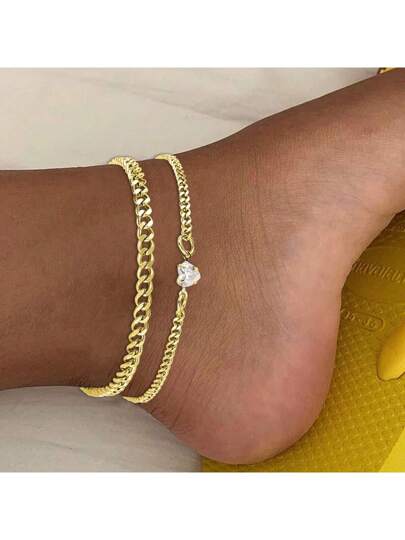 2pcs Simple Stainless Steel Heart Shape & Rhinestone Chain Anklet For Women, Perfect For Dating, Vacation, Daily Wear, And Gift Valentines,Mom,Mother,Mother's Day,Gift - Yellow Gold - View 1