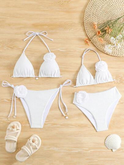 2pcs Solid Color Bikini Set With Seashell Decorated Shoulder Straps & Flower Decoration, Triangle Top And Side Flower Decorated Swimwear Bottom, Summer - White - View 1