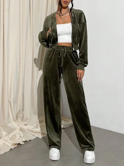 Muchica 2pcs Women's Zip-Up Front Hoodie Sweatshirt And Full Length Pants Set - Army Green - View 1