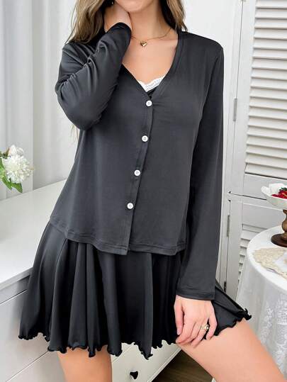 2pcs Women Pajama Set - Bodycon Slip Dress & Jacket - Dark Grey - View 1