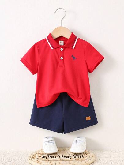 Cozy Pixies 2pcs/Set Baby Boy Dinosaur Pattern Knitted Soft Polo Collar Short Sleeve Top & Elastic Waist Shorts Set - Red - View 1