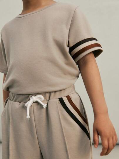 SHEIN 2pcs/Set Kids Boy Casual Graphic Pattern Contrast Rib Crew Neck Short Sleeve T-Shirt And Shorts Knit Set - Khaki - View 5