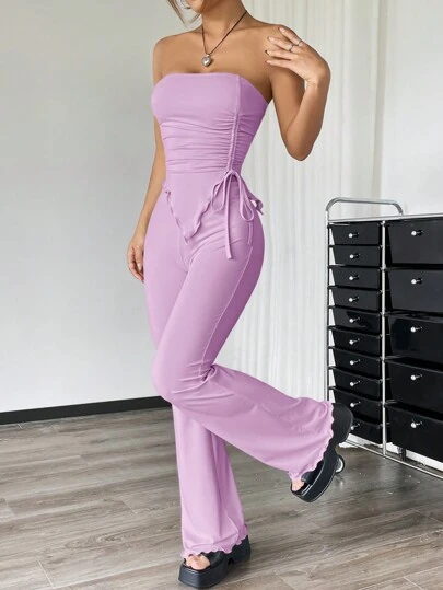 SHEIN EZwear 2pcs/Set Ruched Bandeau Top With Asymmetrical Hem And Flare Pants - Lilac Purple - View 1
