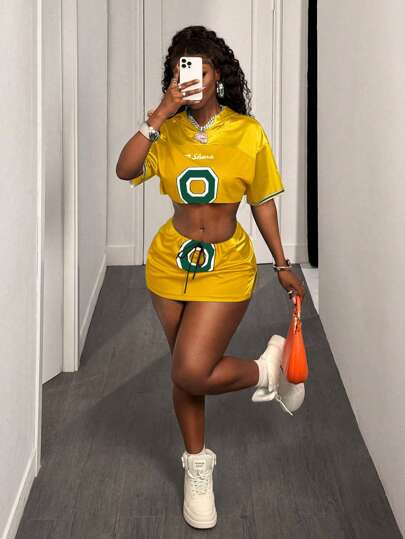 BamGleam 2pcs/Set Women Letter Print Short Sleeve Cropped Top And Sports Style Skirt Shorts Set - Yellow - View 1