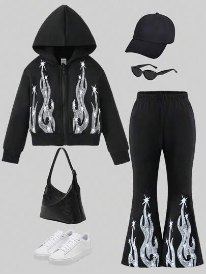 SHEIN 2pcs/Set Young Girl Flame Print Short Hooded Jacket And Flared Pants, Summer - Black - View 1