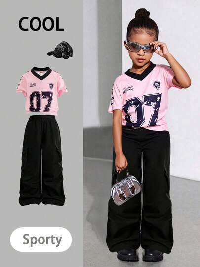 2pcs/Set Young Girl Pink Raglan Sleeve '07' Graphic Sweatshirt & Black Cargo Pants Set, Sports Style Outfit - Pink - View 1