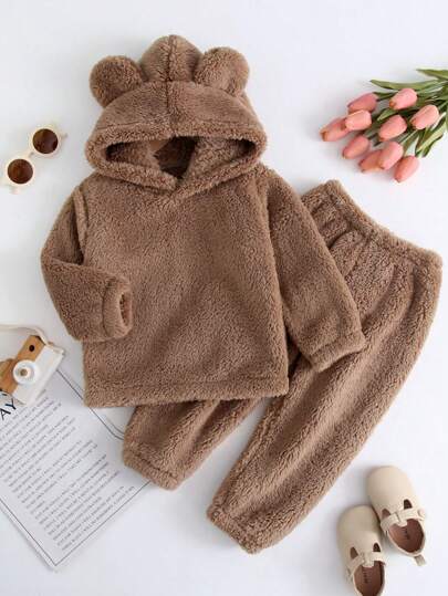 2pcs/set Girls' Cute And Simple Polar Fleece Pajama Set For Autumn And Winter - Khaki - View 1