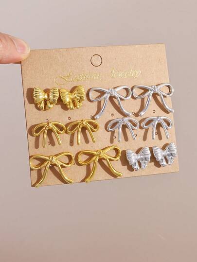 3/6 Pairs Fashionable Bowknot Earrings, Plastic Material, Gold-Plated Women Earring Set, Gift For Her - Multicolor - View 1