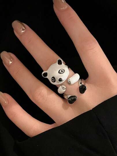 3-Piece Ring Set/Cartoon Cute Panda Open Ring Cute Animal Doll Ring Set Creative Detachable Ring - Black and White - View 1