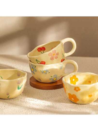 300ml Korean Style Fresh Hand Painted Flower Pattern Ceramic Coffee Mug, Suitable For Home/office/friends Birthday Gift - Multicolor - View 1