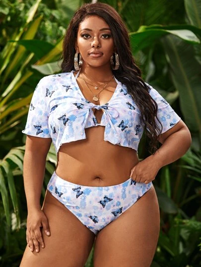 3packs Plus Size Butterfly Print Triangle Bikini & Kimono Summer Beach - Multicolor - View 1