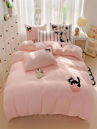3pcs Cartoon Embroidery Quilt Cover & Pillowcases Set, Blogger Style, Single Quilt Cover Set For Student Dormitory Or Apartment, Including 1 Quilt Cover, And 2 Pillowcases - Baby Pink - View 9