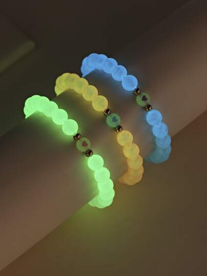 3pcs Glow In The Dark Heart Detail Beaded Bracelet Valentines - Multicolor - View 1