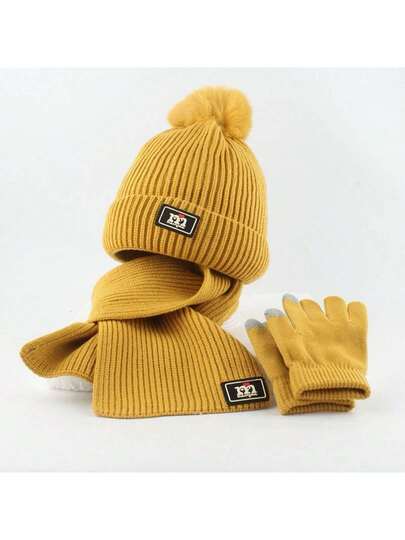 3pcs Kids' Yellow Hat, Scarf And Gloves Set For Warmth In Autumn/winter - Yellow - View 1