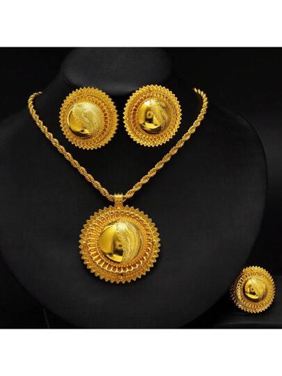 3pcs/Set Classic Golden Color African Style Jewelry Set: Pendant Necklace, Ring, Earrings, Bride Accessories For African Wedding, Gift - A - View 1