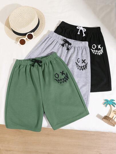 3pcs/Set Tween Boys' Resort Style Printed Straight Loose Knit Shorts, One In Each Of Three Colors, School, Campus, College - Green - View 1