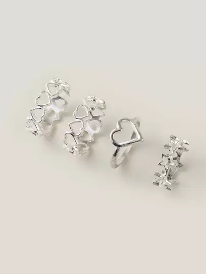 4pcs/Set Hollow Out Heart & Star Shaped Silver Ring Suitable For Daily Wear For Women - Silver - View 1