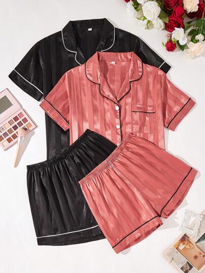 4pcs Women's Contrast Trim Button-Up Short Sleeve Top And Shorts Pajama Set - Multicolor - View 1