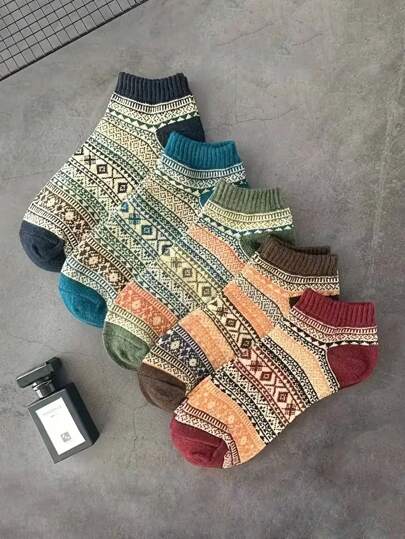 5 Pairs Unisex Vintage Geometric Pattern Ankle Socks - Multicolor - View 1