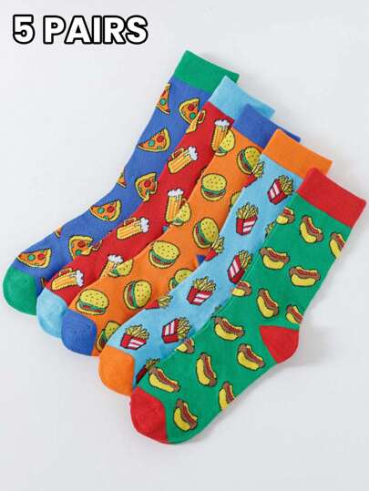 5 Pairs/Sets Of Men's Socks In Autumn And Winter With Fast Food Patterns Of Hamburgers, Hot Dogs, Pizza, Beer, Funny And Interesting Patterns, Suitable For Daily Travel, Home, Office, Festivals, And Gifts - Multicolor - View 1