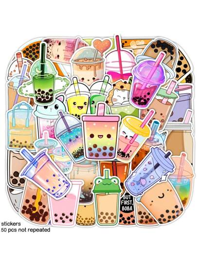 50pcs Faux Pearl Milk Tea Cartoon Decor Stickers For Fridge, Mobile Phone, Notebook, Cute Water Bottles, Pvc Waterproof Stickers - Army Green - View 1