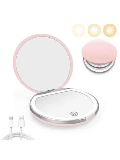 5X Magnifying Lighted Makeup Mirror, 3 Brightness Levels, Portable Foldable Round LED Mirror, 2X Single-Sided Magnification, Mini USB Rechargeable Illuminated Mirror, Unique Gift For Men And Women - Pink - View 1