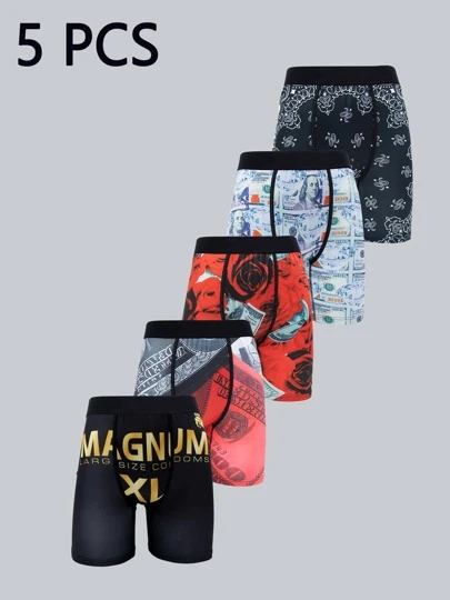 5pcs Pack Men's Printed Long Boxer Briefs - Multicolor - View 1