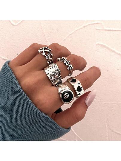 RINTOLER 5pcs/Set Vintage Distressed Gothic Style Spade & Heart Design Rings - ZJ7647-5 Pieces Of Silver Poker Rings - View 5