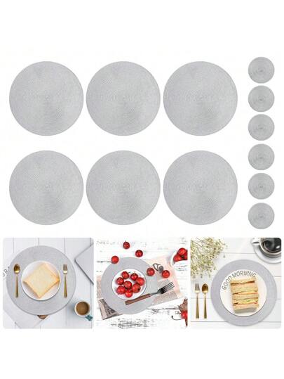 6 Pack Round PP Placemats And Coasters Set - 13.2 Inch Waterproof Non-Slip Table Mats For Dining Decor, Dishwasher Kitchen Tableware - Silver - View 9