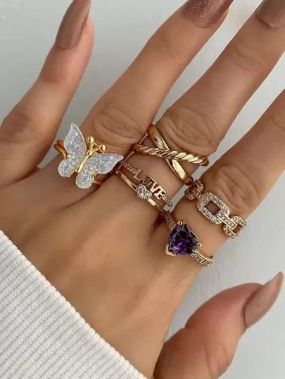 6pcs Butterfly & Heart Decor Ring - Yellow Gold - View 1