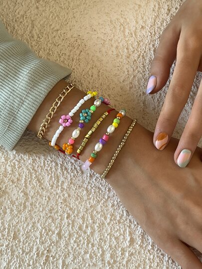 6pcs Flower Decor Beaded Bracelet - Multicolor - View 1