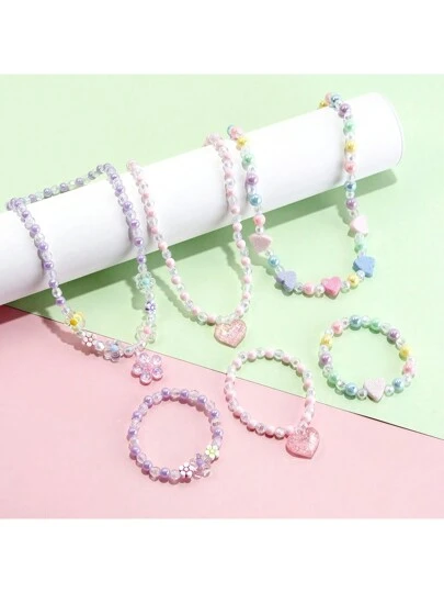 6pcs/Set Cute Heart & Flower Pendant Necklace, Beaded Bracelet Charm Set - Perfect For Holiday, Party, Birthday Gifts, Random Color - Multicolor - View 1