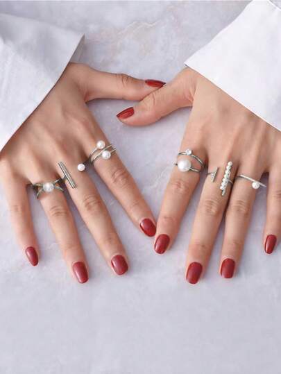 7pcs/Set Simple & Luxury Fashionable Faux Pearl & Rhinestone Open Ring Set For Women - Silver - View 1