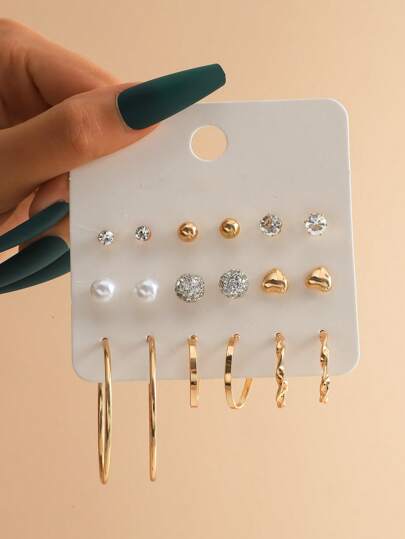 9pairs/Set Fashion Faux Pearl & Rhinestone Decor Earrings For Women For Daily Decoration - Yellow Gold - View 1