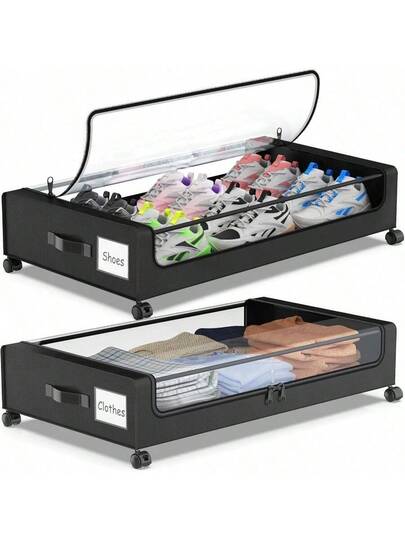 A Bed With Wheels For Storage, 2 Sets Of Bed Storage Containers With Transparent Lids, Bed Storage Boxes For Shoes And Clothes, A Rollable Bed Storage Box For Clothes, Shoes And Blankets, Two Boxes For Sorting Shoes And Clothes. - Black - View 1