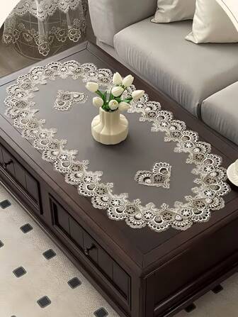 1pc Embroidered Floral Table Runner, Farmhouse Style Polyester Embroidered Hollow-Out Dust Cover, Suitable For Cabinet, Dining Table, Coffee Table, Home Decor And Weddings, Parties, Holidays