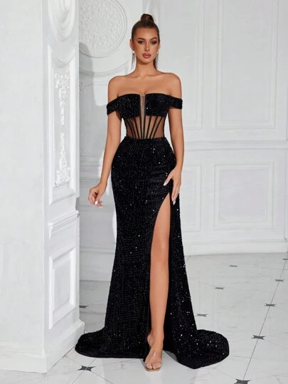 ADYCE Glittering Off-Shoulder Evening Party Dress With Fishbone Waistband, Draping Sash, Front Slit And Open Back Design Black Elegant Formal Prom Wedding Guest Gown, For Graduation, Dinner - Black - View 1