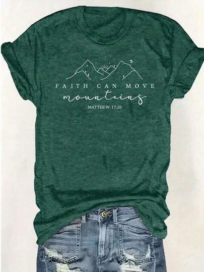 INAWLY Plus Size Women's Letter Mountain Print Round Neck Short Sleeve Casual T-Shirt - Green - View 1
