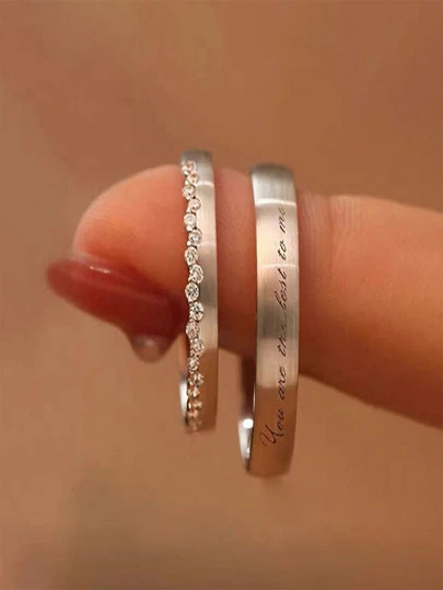1 Pair Adjustable Couple Rings With Embedded Stones, Simple English Engraved Promise Rings For Men & Women - Silver - View 1