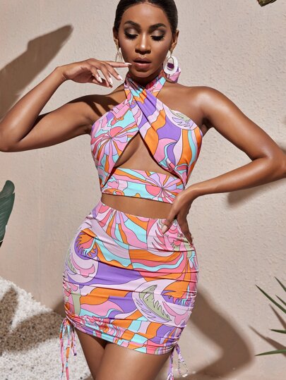 Slaydiva Allover Print Backless Criss Halter Top & Drawstring Skirt - Multicolor - View 1