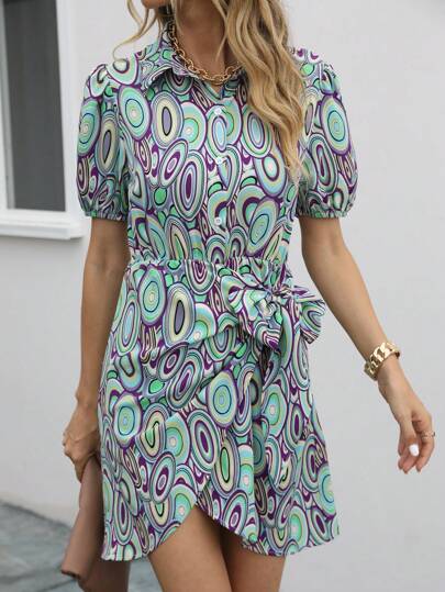 SHEIN Clasi Allover Print Knot Side Wrap Hem Shirt Dress - Green - View 1
