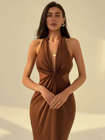 Aloruh Elegant Cross Front Twist Design Sexy Open Back Mesh Patchwork Maxi Stretchy Fitted Fishtail Dress - Brown - View 1
