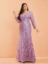 Anpoket New V-Neck Contrast Lace Elegant Plus Size Evening Gown, Pearl Beaded Waist Belt, Long Sleeve, Satin, Maxi Dress, Suitable For Formal Occasions