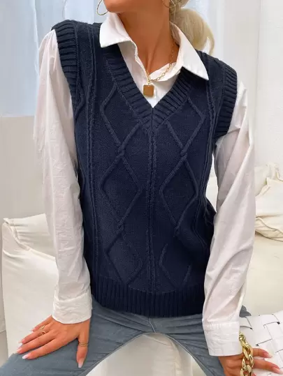 Argyle Knit Sweater Vest Without Blouse - Navy Blue - View 1